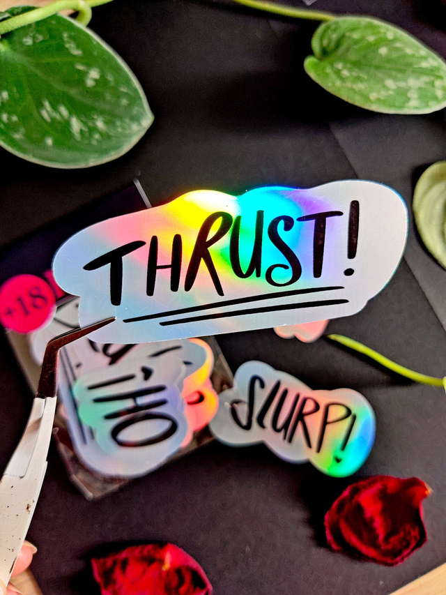 Hand-written NSFW sfx ! Directly printed on holographic sticker printable paper. It can handle some humidity but isn't weatherproof nor fully waterproof !