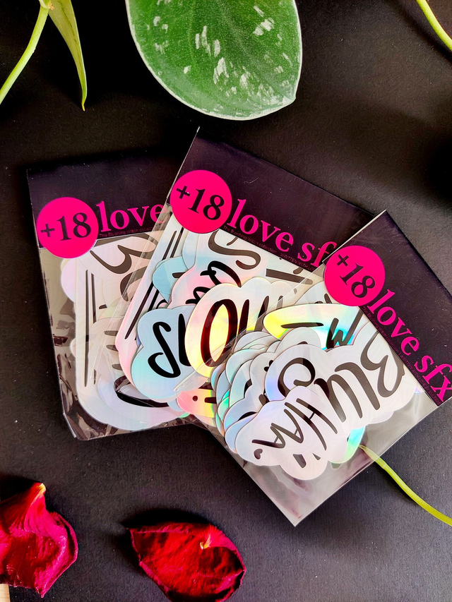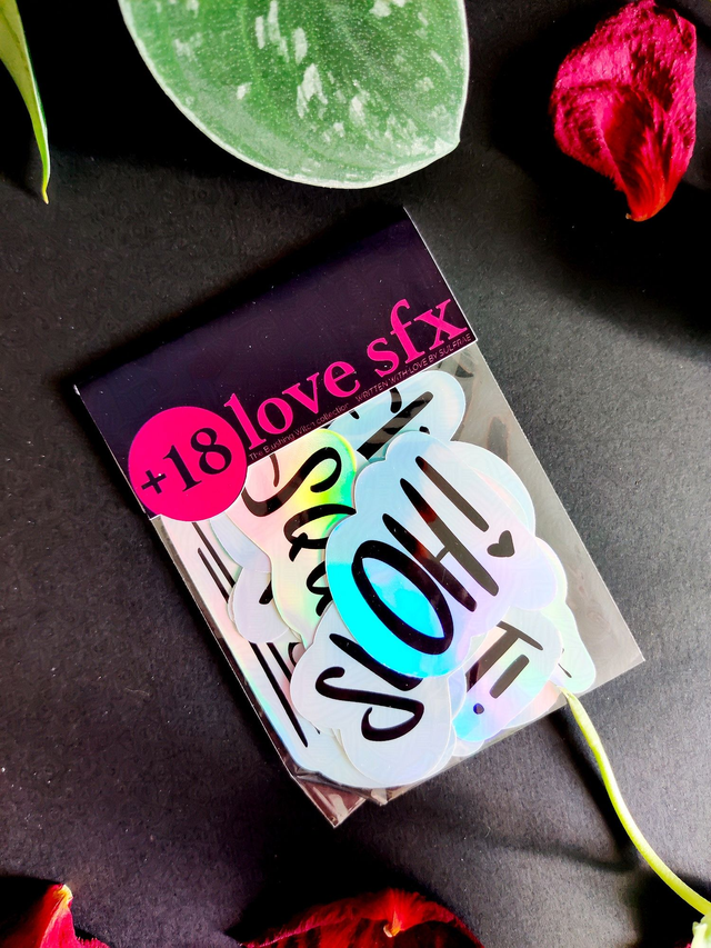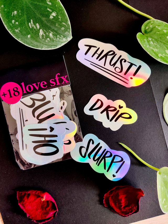 A full set of 10+ holographic unique stickers, handmade packaging and cut at thome ! NSFW sfx from your favorite comics. Just try not to stick them near your boss. Or do.